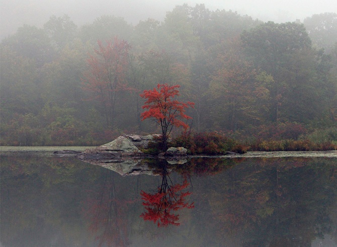 Туман стоит над озером в Хайлендсе, штат Нью-Йорк, США.