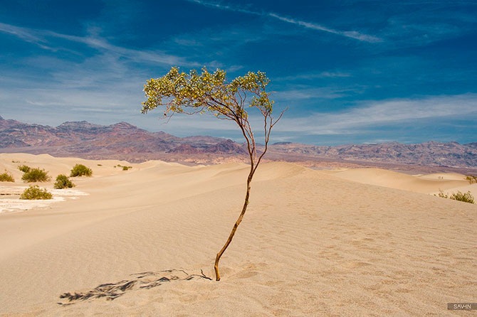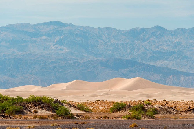 Первой смотровой точкой на нашем пути стали песчаные дюны. Дюны находятся совсем рядом с информационным центром на главной трассе Долины Смерти, поэтому там всегда толпы народа. Но к счастью, большинство туристов ленивы и топчатся около своих автомобилей, поэтому стоит немного пройти вглубь, чтобы ощутить одиночество пустыни: