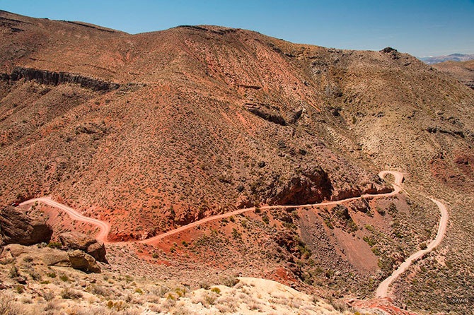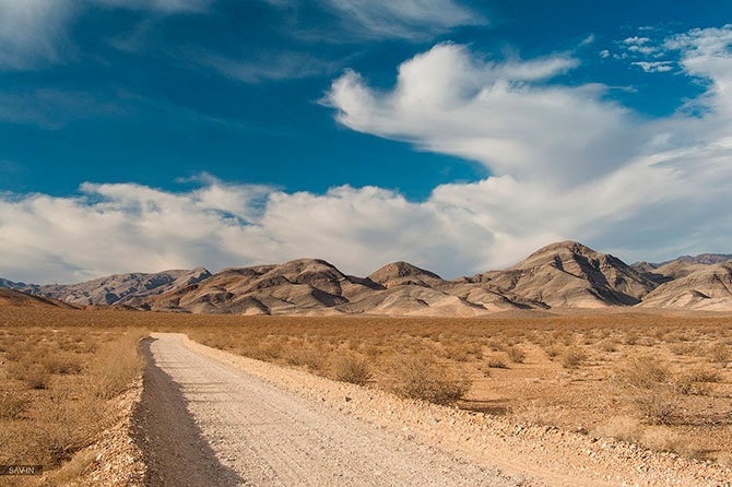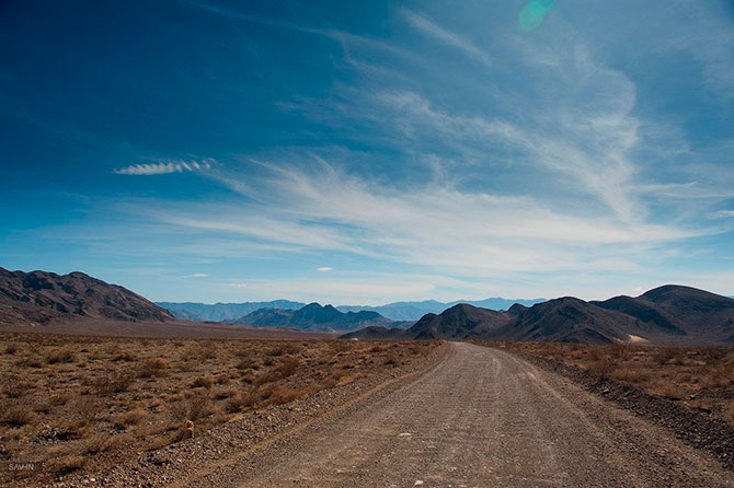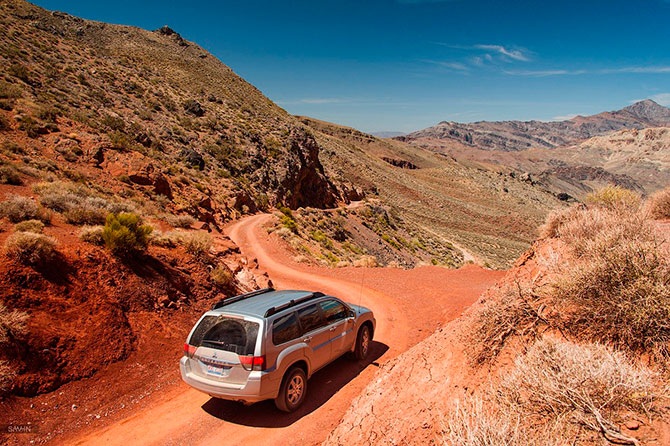Дорога туда в одну сторону 50 км от трассы, по бездорожью! Это самое труднодоступное туристическое место Долины Смерти. И если до этого таблички «Рекомендуется полный привод» не таили в себе опасности, то на этот раз без нашего джипа JEEP Patriot мы бы не доехали до места. Зубодробительня гребенка с острыми камнями на протяжении всех 50 км пути! Очень утомительная дорога. Но, несмотря на тяготы пути и осознание того, что мы тратим время ради очень сомнительной затеи, виды по пути нас бодрили! Хотя иногда дорога казалась безнадежно долгой и унылой: