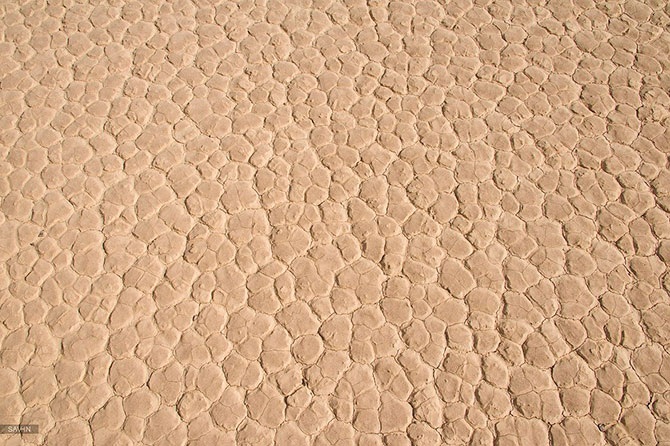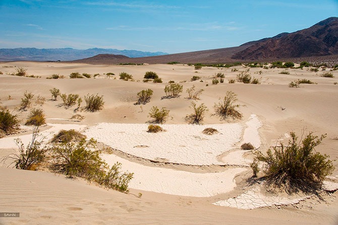 Такое впечатление, что вся вода, которая есть в Долине Смерти — соленая. Но история гласит, что переселенцы умудрялись здесь находить целых 3 источника пресной воды! Возможно, так и было. На месте бывшего озера образовались соляные поля, где кристаллы соли образовали огромные ячейки: