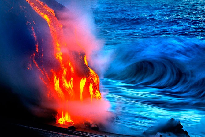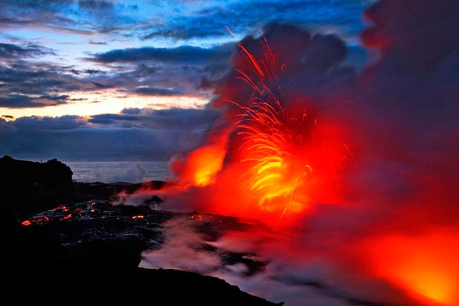 Два фотографа и большие искатели приключений оправились в национальный парк «Гавайские вулканы», чтобы снять с расстояния нескольких метров потоки лавы, излившейся из вулкана Килауэа в Тихий океан.