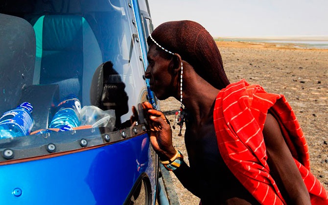 Мужчина заглядывает в вертолет в Кении.