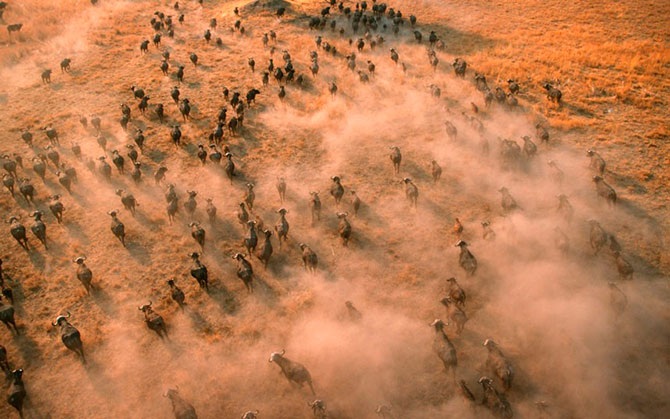 Стадо африканских буйволов в Кении сфотографировано с воздуха.