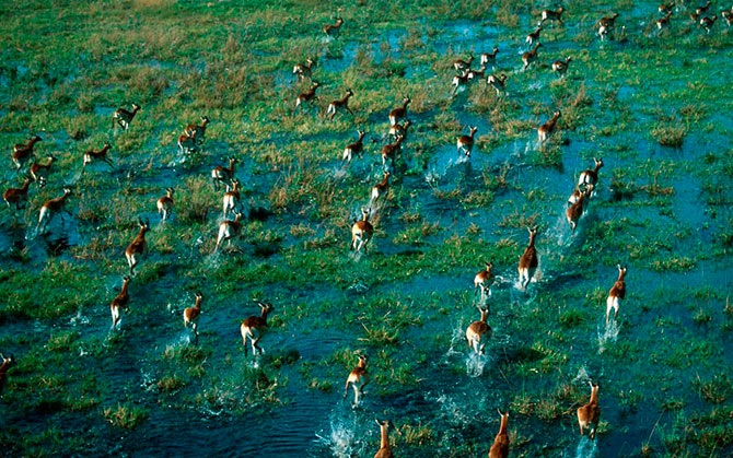 Вид с воздуха на бегущих по залитым водой долинам красных антилоп-личи, дельта Окаванго, Ботсвана.