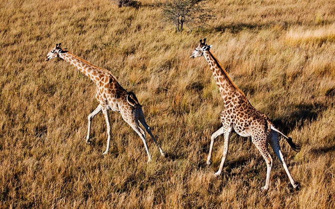 Жирафы бегут по дельте Окаванго, Ботсвана.