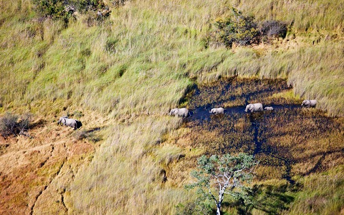Вид сверху на африканских слонов в дельте Окаванго, Ботсвана.