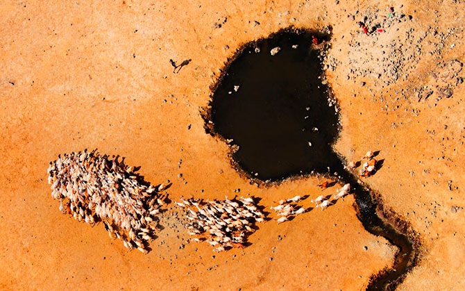 Пастухи присматривают за стадом коз у источника Короли в пустыне Чалби на севере Кении, у границы с Эфиопией.