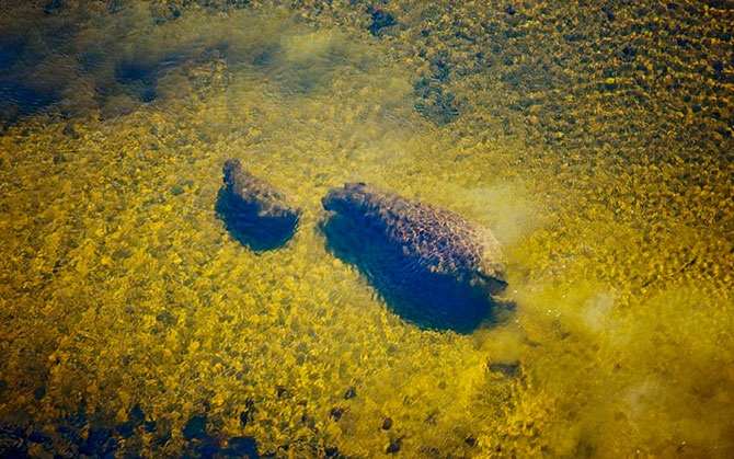 Вид сверху на двух гиппопотамов под водой в дельте Окаванго, Ботсвана.