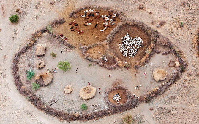 Вид сверху на загон для скота Маасаи в Кении.