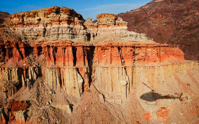 Вертолет отбрасывает тень на утесы во время полета над долиной Сугута в Кении.
