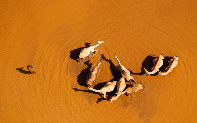 Вид сверху на верблюдов в воде в пустыне Чалби, Кения.