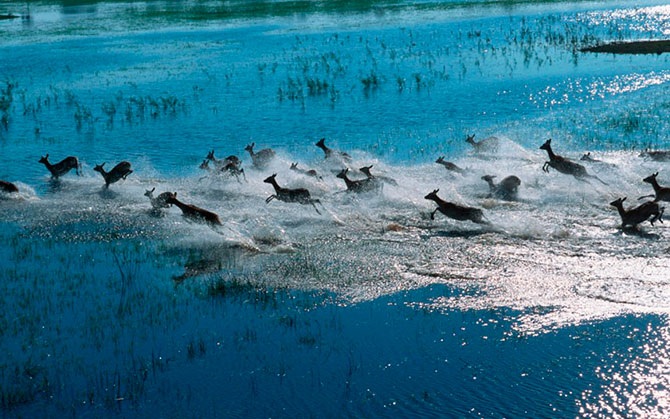 Красные антилопы-личи бегут по залитой водой долине в дельте Окаванго, Ботсвана.