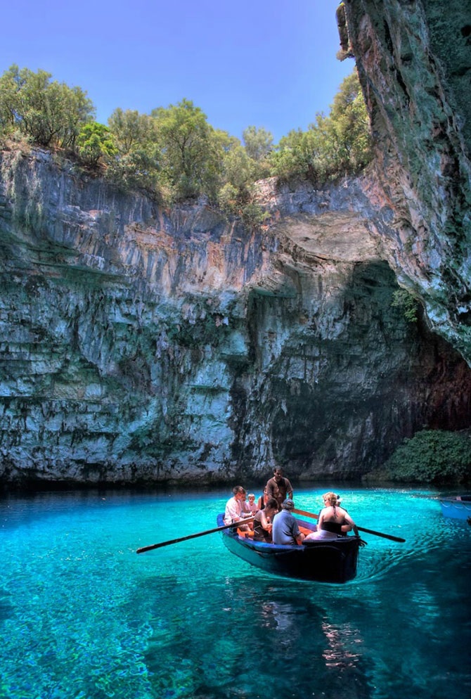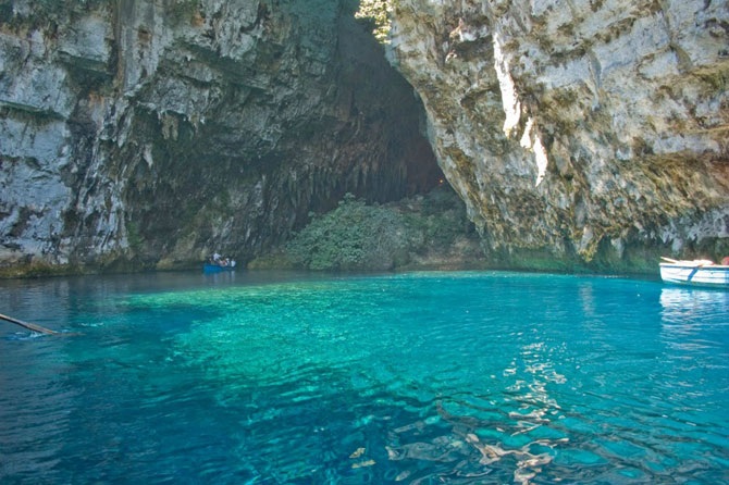 Вода в озере лазурная, глубина небольшая, сверху нависает каменный купол с огромной дырой, проникая через которую солнечный свет создаёт удивительные блики в воде и на стенах Мелиссани.