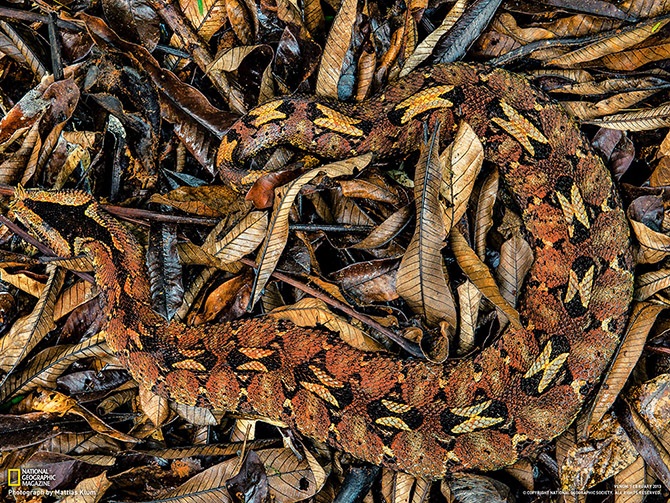 Гадюка-носорог — это вид высших змей из рода африканских гадюк. Свое название она получила благодаря острым чешуйкам, украшающим кончик морды. Гадюка-носорог очень ядовита, а в сочетании с идеальным камуфляжем делает ее смертоносным оружием, Камерун.