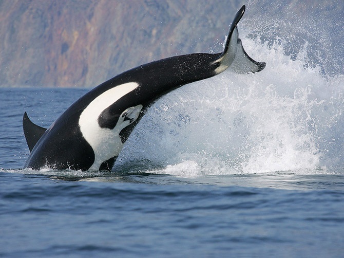 Могучее морское животное — молодая косатка — охотится на лосося в Авачинском заливе.