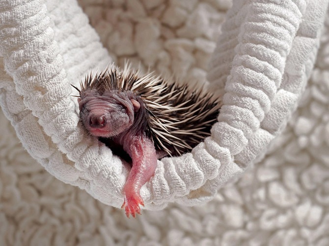 Всего четырех дней от роду и 6,4 сантиметра в длину, брошенный ежонок уютно устроился на сложенном полотенце в центре спасения в Роял-Танбридж-Уэллс, графство Кент. Тепло и чистота очень важны для здоровья этих крошечных зверьков.