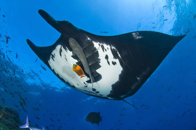 35-сантиметровая рыба-ангел чистит тихоокеанского ската в водах островов Ревиллагигедос, Мексика.