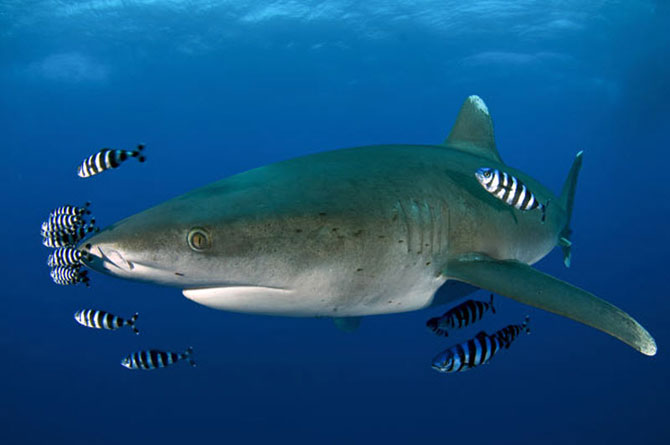 Белоперая акула в окружении рыбы-лоцман в Красном море