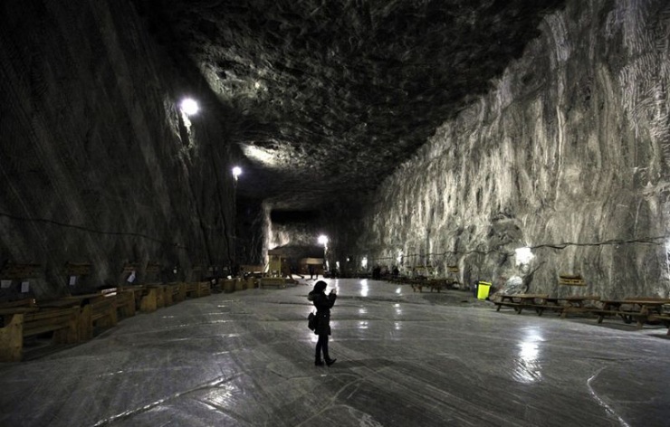 8. Турист делает снимки внутри Соляной шахты Прайд в 350 км к северу от Бухареста, 4 марта 2013 г. Часть рудника, расположенная на глубине 160 метров и в 1,3 км от входа, открыта для туристов, а также используется в качестве места лечения респираторных заболеваний, таких как бронхит или астма, так как имеет высокую степенью ионизации воздуха и атмосферное давление выше, чем на поверхности. (Reuters/Radu Sigheti)