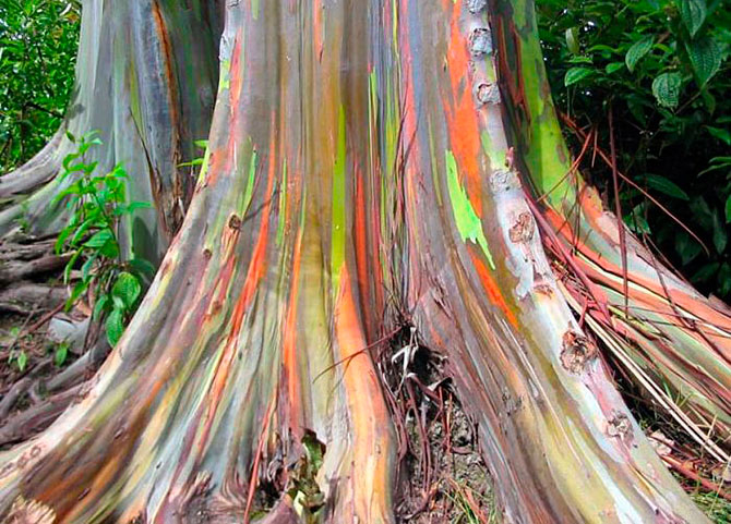 Другое интересное дерево — радужный эвкалипт. Кора этого удивительного дерева буквально притягивает взгляд — кажется, будто здесь поработал какой-то художник. Сами по себе эвкалипты, даже не обладающие радужной корой, являются удивительными деревьями. Уникальность их состоит в том, что самые высокие из когда-либо найденных деревьев являлись именно эвкалиптами. Например, в одном отчёте 1872 года упоминается упавший эвкалипт, высота которого составляла более 150 метров!