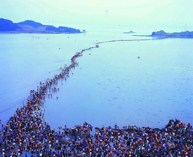 Под «чудом Моисея» имеется в виду то, что в течение очень краткого периода весной можно ходить по прибрежным водам вокруг небольшого южнокорейского острова — вчитайтесь: здесь можно ходить по воде.