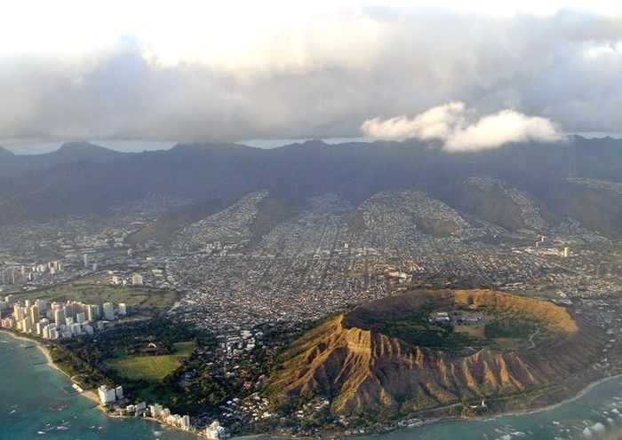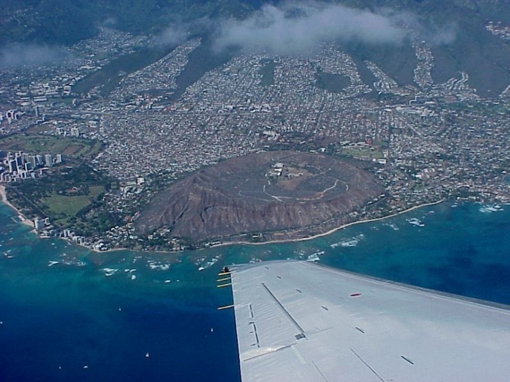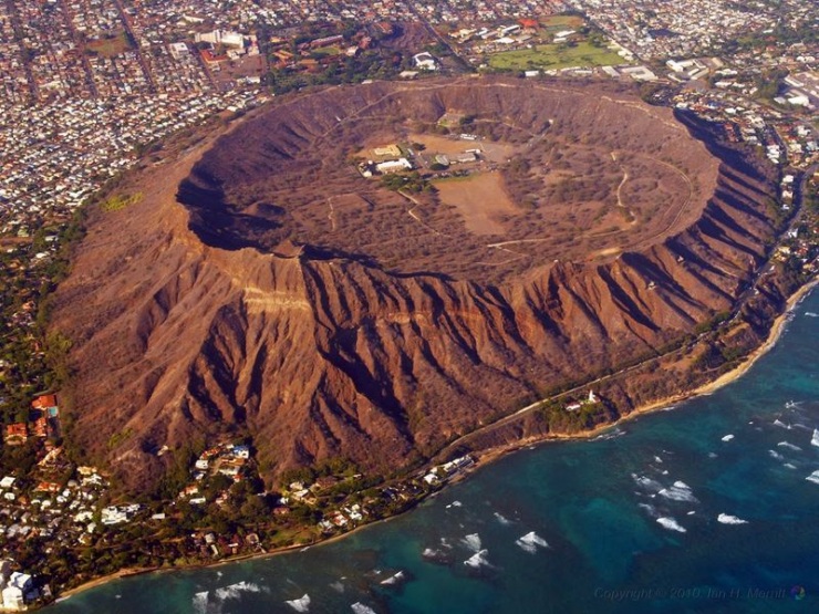 Даймонд-Хед, что переводится на русский как Алмазная или Бриллиантовая Голова, звучит на гавайском как Le’ahi и означает «лоб (lea) желтоперого тунца (ahi)». Кратер получил свое английское имя в начале 18-го века, когда британские моряки увидели искрящиеся на свету кристаллы кальцита и подумали, что нашли алмазы.Этот широкий кратер в форме блюдца был сформирован во время единственного взрывного извержения.
