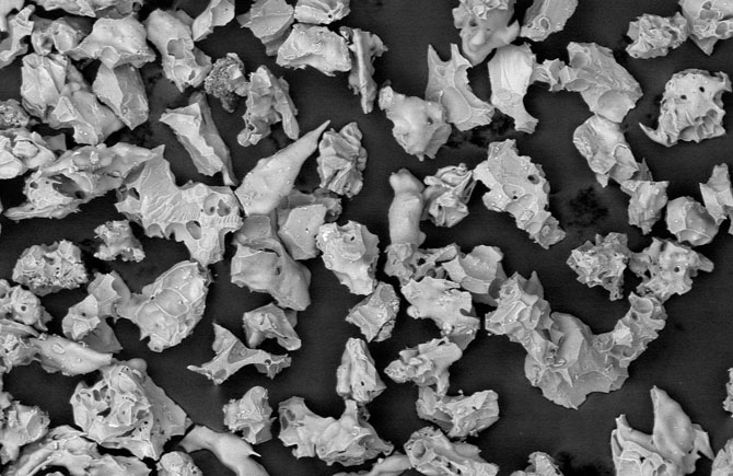 Так выглядят под микроскопом частички золы после извержения вулкана Павлова на Аляске, 18 мая 2013.