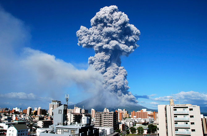 Извержение вулкана Сакура-Джима на японском острове Кюсю, 23 ноября 2013. В настоящее время это самый активный вулкан в Японии и извергается несколько сотен раз в год. Извержения, как правило, небольшие, но пепел поднимается на высоту 3000—3800 метров и более.