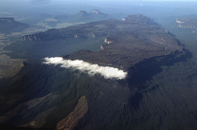 Ученые утверждают, что эти горы, состоящие из твердого песчаника, с крутыми, почти отвесными склонами и плоскими, усеченными вершинами, — древнейшие в мире. Они образовались вследствие разрушения огромного плато, в доисторические времена простиравшегося от берегов Атлантического океана до границ бассейнов рек Ориноко, Амазонка и Риу-Негру. Еще в те времена, когда Африка и Южная Америка были единым целым, около 200 миллионов лет назад, это плато возникло на месте гигантского озера.