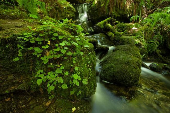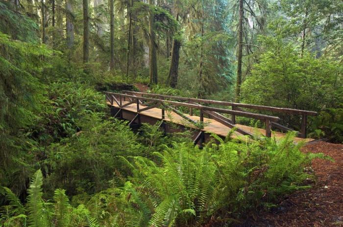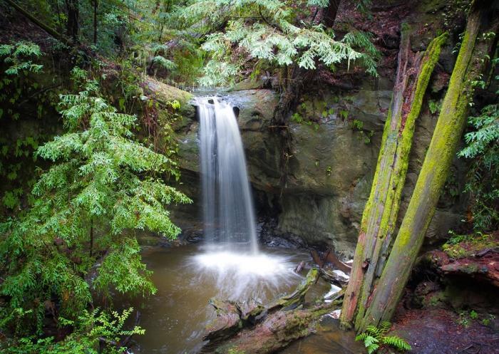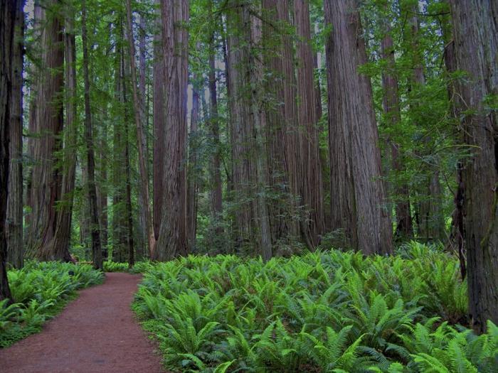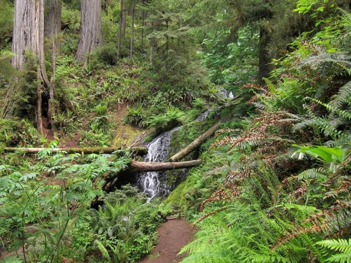 Тропа в Прери-Крик Рэдвудс. Описание NPS: «Тропа ведет вас через туманные коридоры из красного дерева. Вдоль пути стоят семьи елей Дугласа, крапчатый болиголов и ель Ситка, все они проживают в тени самых высоких деревьев в мире. Лесной настил создает влажное убежище для красных древесных полевок, тихоокеанских гигантских саламандр и банановых слизней. Вдоль ручья разбросаны участки цветущего весной белого триллиума. Рядом с водопадом (10 футов каскада над темно-зелеными, замшелыми скалами) в каждом направлении наклонились тяжелые ветви большого клёна». Фото: Джастин Керн
