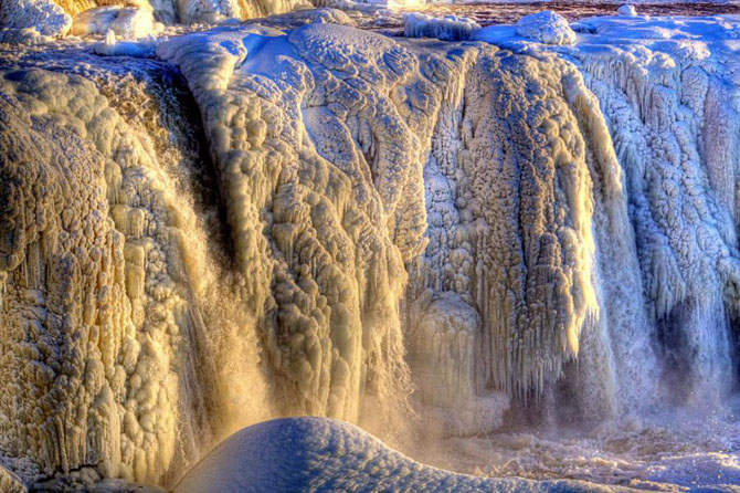 Замерзшие водопады Ридо (Rideau) в Оттаве, Канада. Название водопадам дал Самуэль де Шамплен в 1613 г., для которого вид падающей воды напоминал занавес (rideau — занавес, франц.). Позднее в честь водопадов получили название река Ридо, а в честь неё — многие другие объекты в Оттаве.
