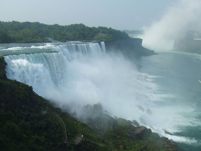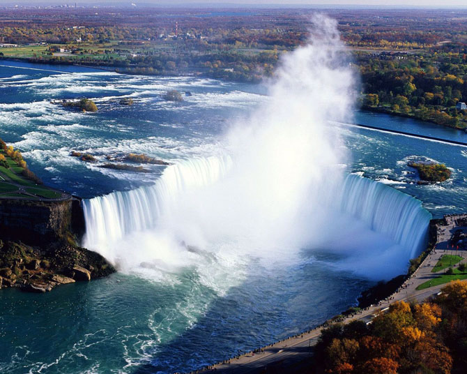 Ниагарский водопад на северо-востоке США входит в число самых мощных в мире — около 2,8 миллионов литров воды в секунду падает с высоты 53 метров. Туристы любят Ниагарский водопад за то, что до него относительно легко добраться и осмотреть со всех сторон.