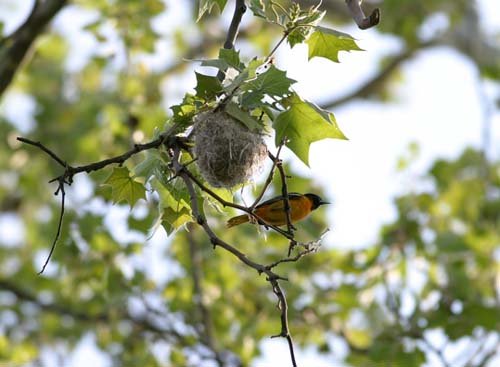 Его строит только самец. Он выбирает развилку ветки, свисающую вниз, и сплетает на ней кольцо таким образом, чтобы его нижняя часть служила насестом на весь период строительства.