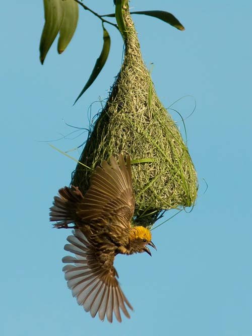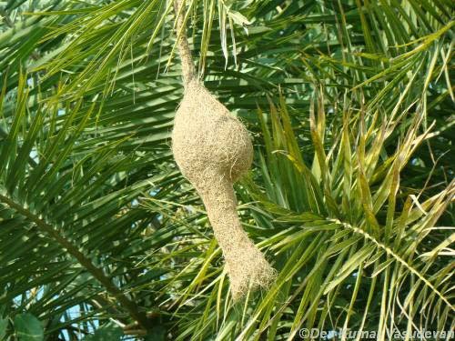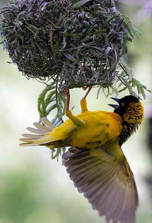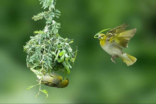 Закончив гнездо правильной круглой или удлиненной формы (в зависимости от вида ткачика), самец начинает привлекать самку.