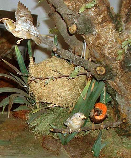 Если же гнездо приходится самке по вкусу, она вступает во владение им и почти сразу спаривается снаружи. Теперь самцу запрещено залезать в гнездо до появления птенцов, и он продолжает плести внешнюю часть, добавляя входной коридор и оформляя его края. После этого самец уже не пытается укрепить гнездо, освежить его или отремонтировать. Постепенно травяное плетение гнезда высыхает и приобретает охристый цвет.