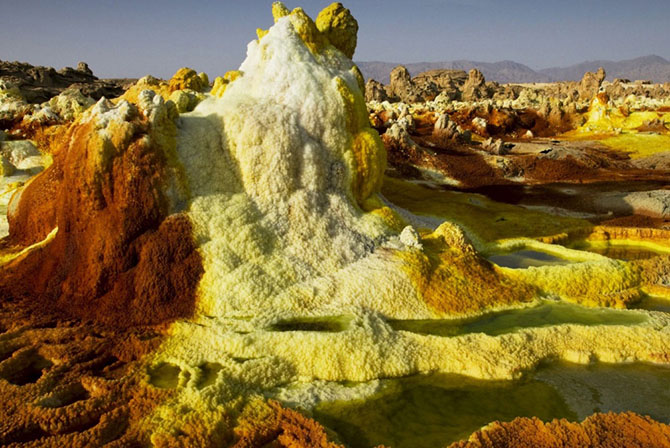 Даллол — это название спящего вулкана, а также расположенного рядом заброшенного селения в Эфиопии. Вулкан Даллол и его окрестности известны как самое жаркое место на Земле, так как в период с 1960 по 1966 годы здесь был установлен абсолютный рекорд среднегодовой температуры (+34 ºC). А еще это место выглядит абсолютно инопланетным благодаря застывшим кристаллам калийных солей, железа, марганца, вымытых на поверхность горячими источниками.