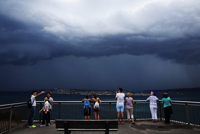 Туристы любуются приближающейся грозой с пристани в Сиднее.