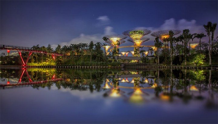 В Сингапуре практически каждому будет предложен для экскурсии Gardens by the Bay. Это дизайнерский лес, сочетающий в себе уникальные природные явления и технологические процессы, придающие растениям замысловатые формы и подсветку. Железные и бетонные опоры, которые выглядят как вековые деревья — это каркасы для вьющихся растений, папоротников и эпифитов.