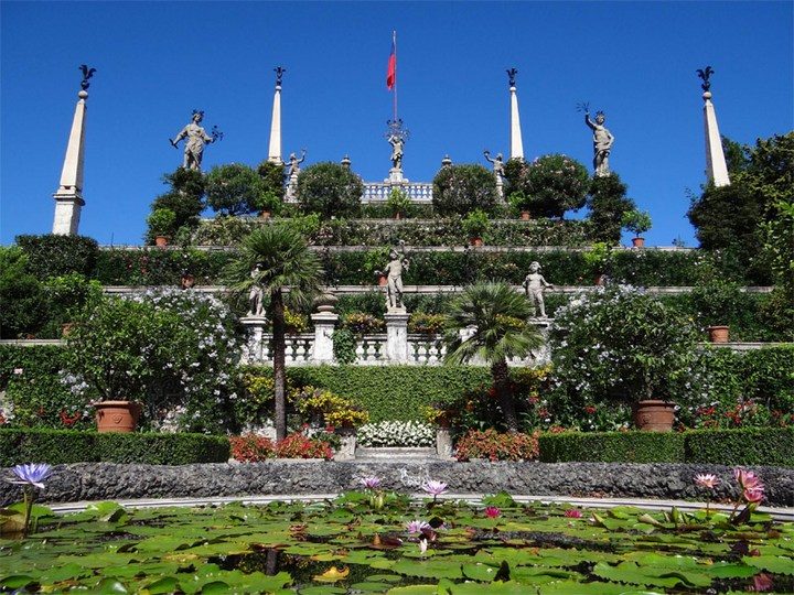 Итальянский Gardens on Isola Bella находится на острове одного из самых живописных озер, и содержит по центру роскошный дворец, заплетенный множеством видом вьющихся растений. Верхушку плавающей «пирамиды» украшает единорог — символ семьи создателя этого чуда, а по всей территории острова живут экзотические животные.