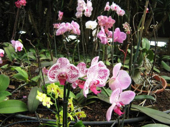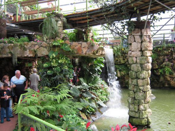 На небольшой территории гармонично вписались оранжерея, маленький фонтан со смотровой площадкой, несколько теплиц и питомник для бабочек. Все это связано между собой и удобно оформлено для неспешной прогулки и отдыха. Итак, мы заходим. В достаточно просторной оранжерее мы попадаем в совсем другой мир. Искусственные гроты, водопады и конечно же орхидеи. Итак — заходим
