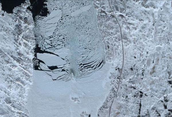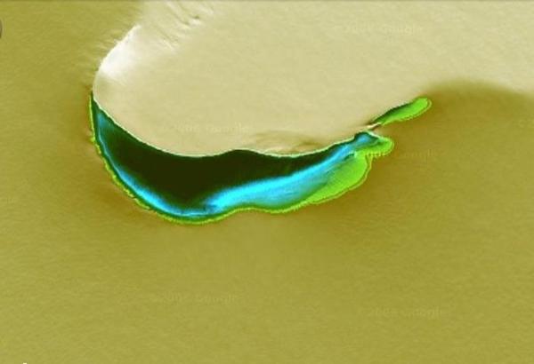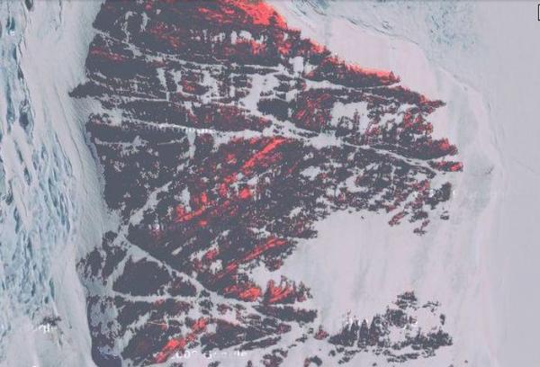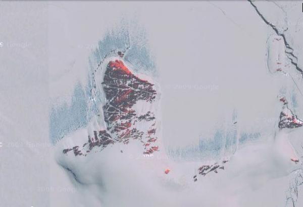 карта GoogleКровавый снег Это снимок Антарктики со спутника. Сквозь снег пробиваются красные горы.
