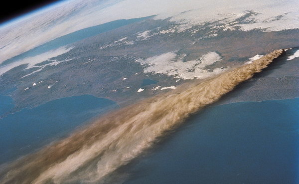 Пепел, прорывающийся через слой облака над Chaiten, Чили, 5 мая 2008 (Image Science and Analysis Laboratory, NASA-Johnson Space Center)
