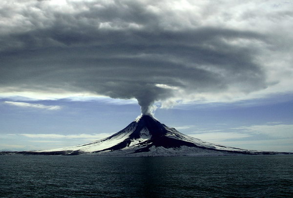 3,500-футовая Кальдера Okmok, которая состоит из круглого кратера приблизительно 1 600 футов глубиной, 6 миль шириной, прорвалась утром 12 июля 2008 (AP Photo Alaska Volcano Observatory)