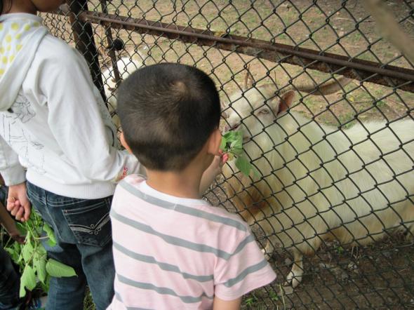 В громадном по размеру загоне паслись несколько козочек, козлят (сущ.) и папаша, бородатый и с кручеными рогами. Хотя характер у него — покладистый. Он добродушно принимал угощения от детишек и был весьма всем доволен.