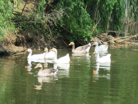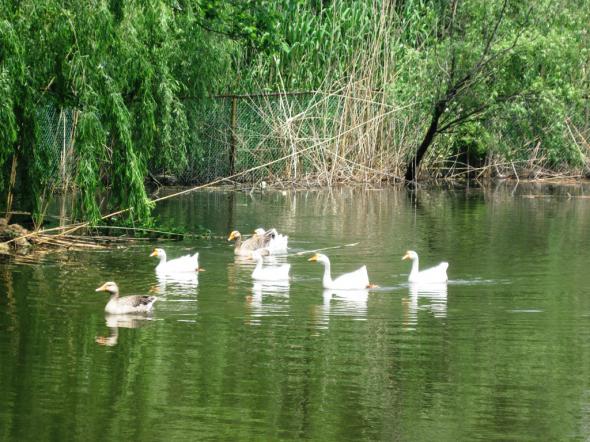 На смену красавцам-рогоносцам приходят водоплавающие. Два больщущих пруда, максимально похожих на естественную среду обитания, в распоряжении гусей — белых и серых — а также черных лебедей.