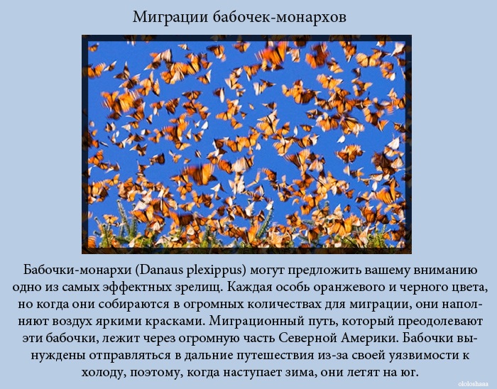 Бабочки-монархи широко известны благодаря своим миграциям. Хотя ни одна отдельно взятая бабочка никогда не совершала полное путешествие длиной в 3200 километров, несколько поколений за год в общей сумме преодолевают такое расстояние.