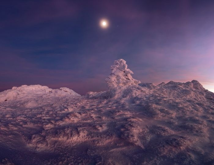 В зимних горных пейзажах северной части Японии есть удивительная особенность – деревья покрытые льдом и снегом. Их называют снежными монстрами.