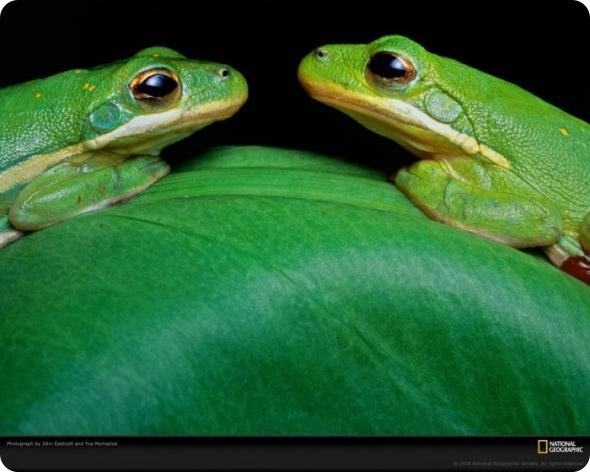На ночном рандеву две зеленых древесных лягушки встречаются лицом к лицу на листе в дельте реки Атчафалайя (штат Луизиана). Зеленый цвет, наверное, чаще всего встречается в природе: он повсюду — начиная с листьев, травы, мха и кончая змеями, бабочками и даже северным сиянием. Зеленый символизирует жизнь, жизнеспособность, природу и, конечно, охрану окружающей среды.