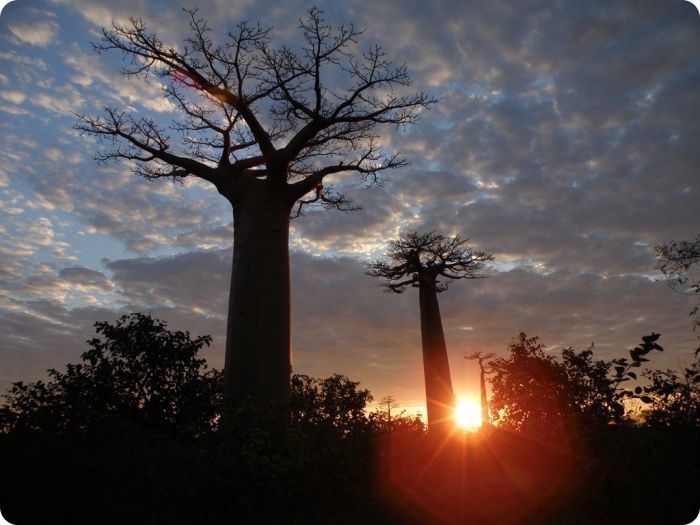 Баобаб знаменит своими необычными пропорциями. Это одно из самых толстых деревьев в мире — при средней окружности ствола 9—10 м, его высота всего 18-25 м.(в «Книге рекордов Гиннесса» за 1991 г. рассказывается о баобабе, имевшем 54,5 м в обхвате). Наверху ствол разделяется на толстые, почти горизонтальные ветви, образующие большую, до 38 м в диаметре, крону. В сухой период, зимой, когда баобаб сбрасывает листву, он приобретает курьёзный вид дерева, растущего корнями вверх. Продолжительность жизни баобабов вызывает споры — у них нет годичных колец, по которым можно достоверно вычислить возраст. Проведённые методом радиоуглеродного анализа (по С14) подсчёты показали более 5500 лет для дерева диаметром 4,5 м, хотя по более осторожным оценкам баобабы живут «всего» 1000 лет.