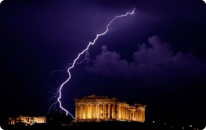 Вспышка молнии освещает небо над древним храмом Парфенон на Акрополе во время сильного ливня в Афинах, Греция, 28 июня 2010 года.